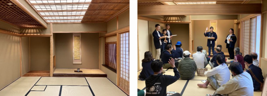 京都モダン建築祭の開催に合わせ、京都ならではのおもてなしの場として京都市役所本庁舎内に整備した「お茶を点てられる和室」を公開し、銘木屋さんのインターン生が和室に使用した木の魅力やしつらえを解説します。