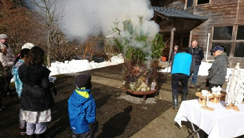■内容:花しめ飾り等の正月飾りや書初めを燃やす「どんど焼き」と餅つきを行います。