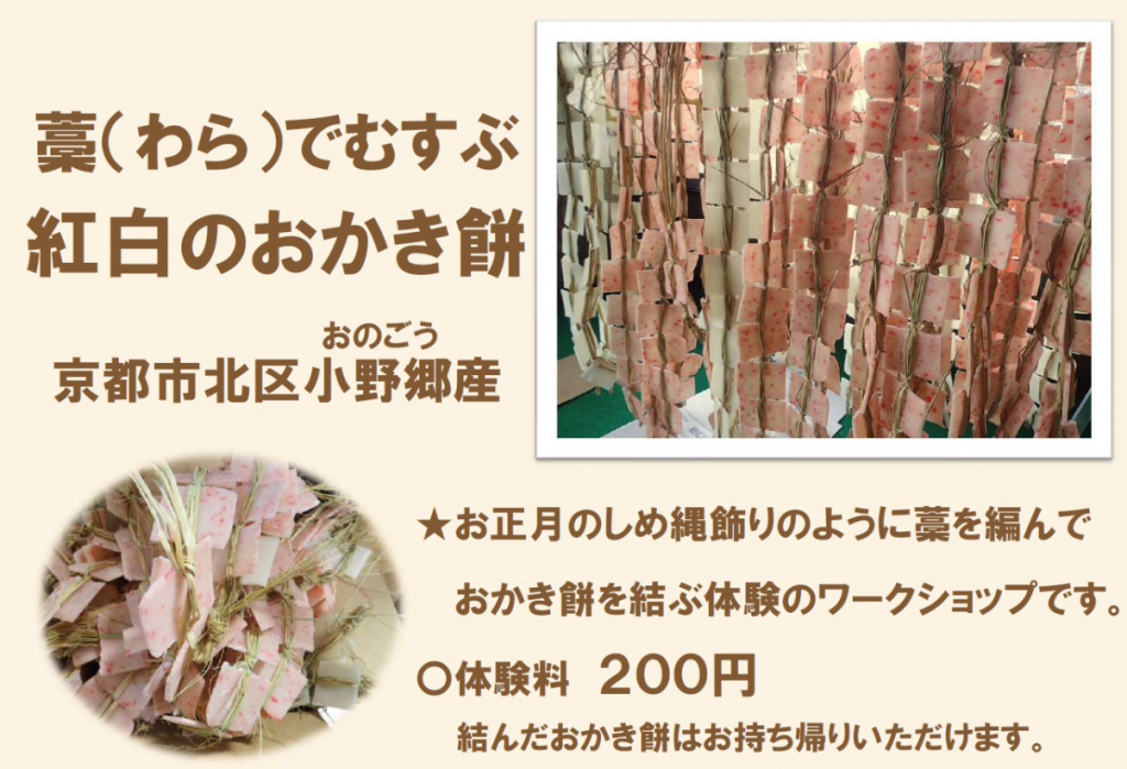 『北区小野郷産おかき餅の藁結びワークショップ』地域産のもち米と藁(わら)を使ったワークショップです。初心者向けのわら細工で、おかき餅はお持ち帰りいただけます。