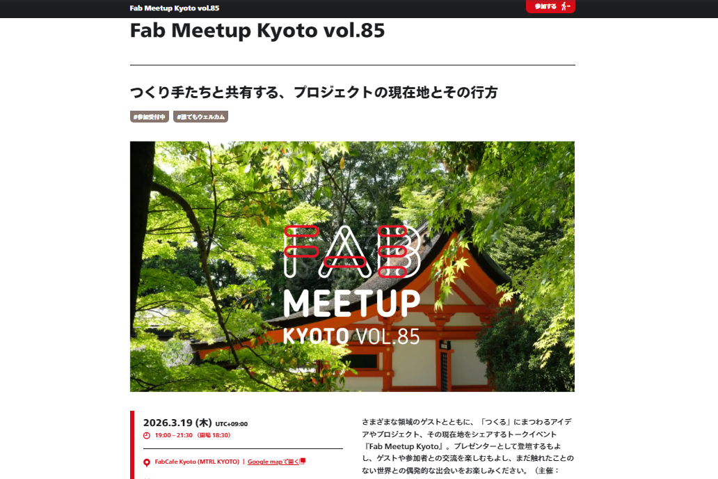 2026年3月19日(木)夜に、京都・清水五条にあるFab Cafe Kyotoにて開催される「Fab Meetup Kyoto vol.85」イベントに、匠弘堂代表の横川氏が登壇します!