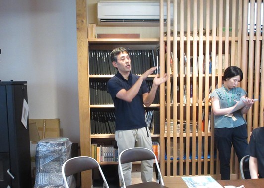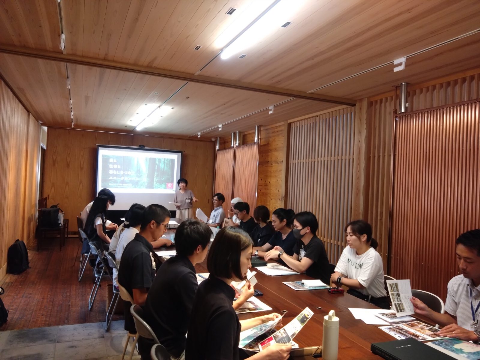 会場は株式会社三角屋の事務所兼打合せスペースをお借りし、9事業者、計14名の方々にご参加いただきました。ミーティングでは、株式会社三角屋 稲岡氏により新社屋の紹介および同社の仕事への姿勢、さらに株式会社紅中 高田氏により木育への取り組みについて発表いただきました。