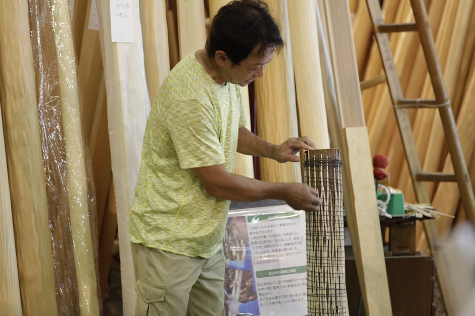 さらに、自然に凹凸模様が生じた希少な「天然出絞丸太」や、それを人工的に再現した「人造絞丸太」も取り扱っています。人造絞り丸太は、山で育つ木に箸状の材を針金で巻き付け、数年成長させることで模様をつけるもので、1本の丸太に400〜800本もの材を手作業で差し込む非常に手間のかかる工程が特徴です。