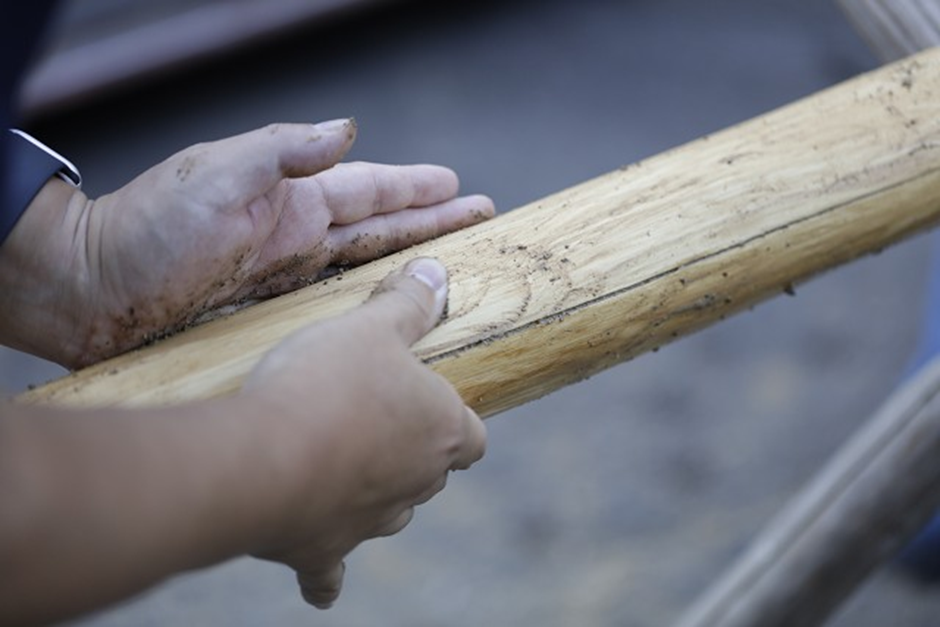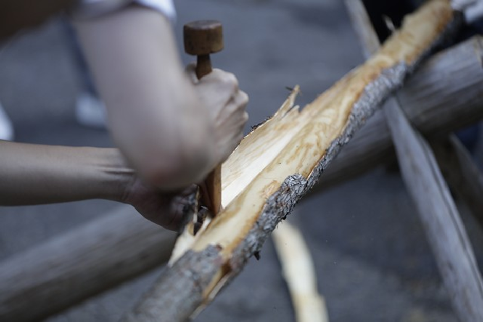 (丸太の皮剥き作業の様子)