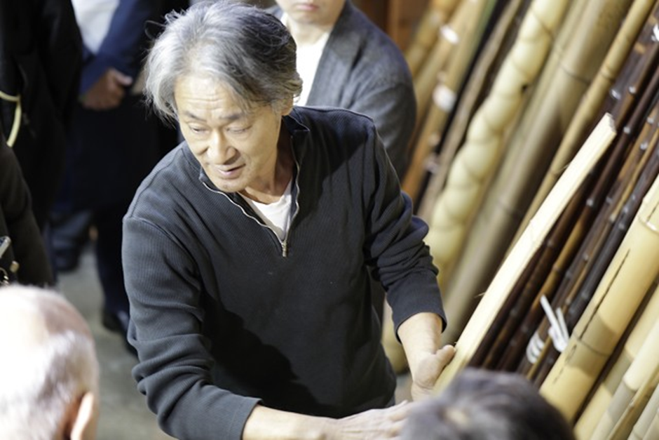 特に印象に残ったのが「煤竹(すすだけ)」の話です。煤竹とは、茅葺き屋根の古民家で使われていた竹が、囲炉裏の煙に180年から200年もの長い年月燻されることで生まれる竹です。煙によって色づいた煤竹は、深みのある茶褐色をまとい、一本一本異なる模様を持ちます。これは人為的に作れるものではなく、暮らしの時間がそのまま刻み込まれた素材だという説明に、竹という素材の奥深さを感じました。良質な煤竹は古民家一棟からごくわずかしか取れず、現在では新たに生み出すことがほぼ不可能な、非常に貴重な素材となっています。