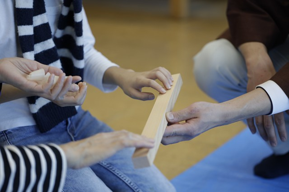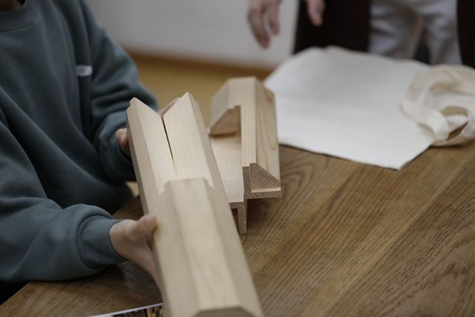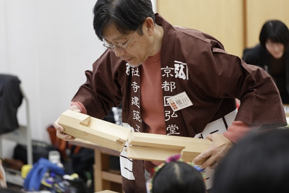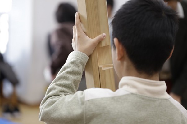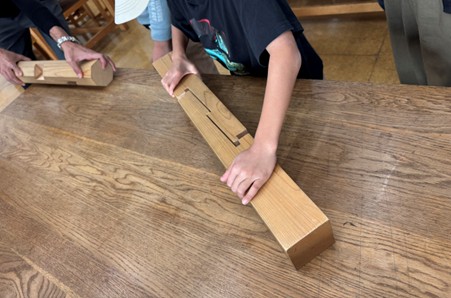 子どもたちが特に夢中になったのが、釘を使わずに木と木をつなぐ「継手(つぎて)」の体験。代表的な「金輪継ぎ(かなわつぎ)」 の模型を前に、「かたい!」「全然とれない!」「パズルみたい!」と大興奮。