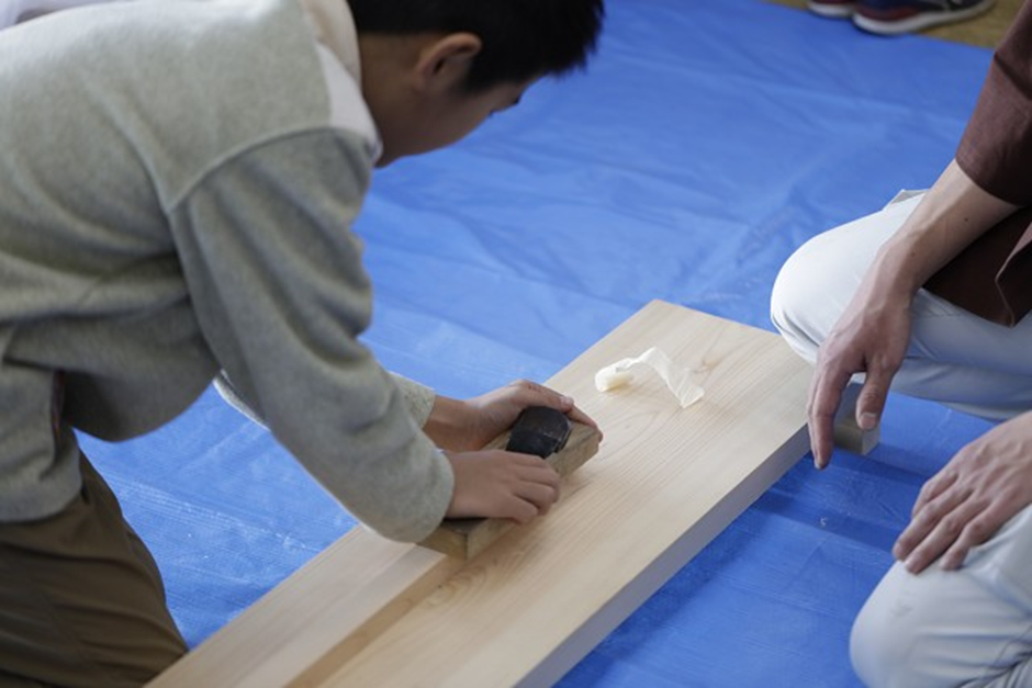 さらに、宮大工の稲葉さんによる鉋(かんな)掛け体験では、削った瞬間に広がる木の香りに、子どもたちは