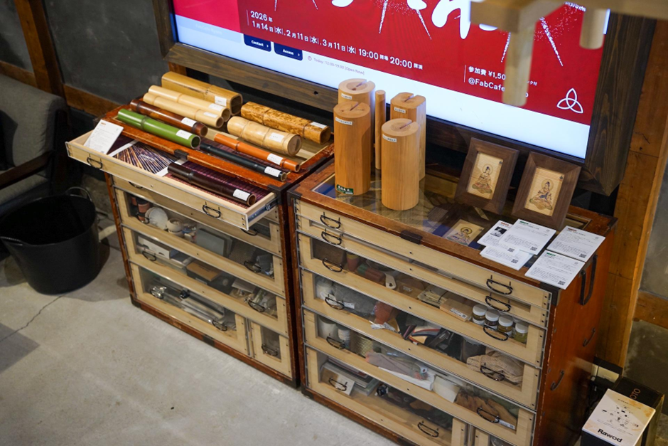 会場となったFabCafe Kyotoは、3Dプリンターやレーザーカッター等のデジタルものづくりマシンを設置した、“デジタル“と”リアル“の壁を自由に横断し、未来のイノベーションを生み出す場です。クリエイティブなアイデアで社会へ挑戦するすべての人を応援するFabCafe Kyoto。「木と暮らすデザインKYOTO」の方向性と重なり、今回、本展の会場としてご協力いただきました。
