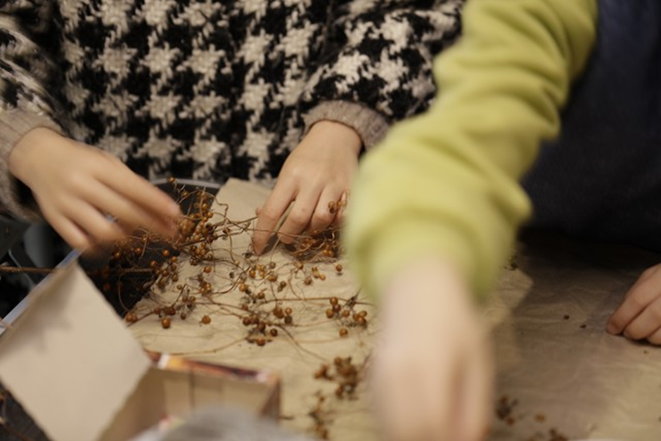 講義の後半では、森の素材を使ったガーランドづくりを行いました。机の上には、サクラやイチョウ、クヌギ、エノキの落ち葉、アラカシやスダジイのどんぐり、小枝やツルなど、森から集められた多彩な素材が並びます。参加者はそれぞれの葉の形や色の違いを観察し、どんぐりの帽子の模様を比べ、手触りや香りを確かめながら素材を選びました。